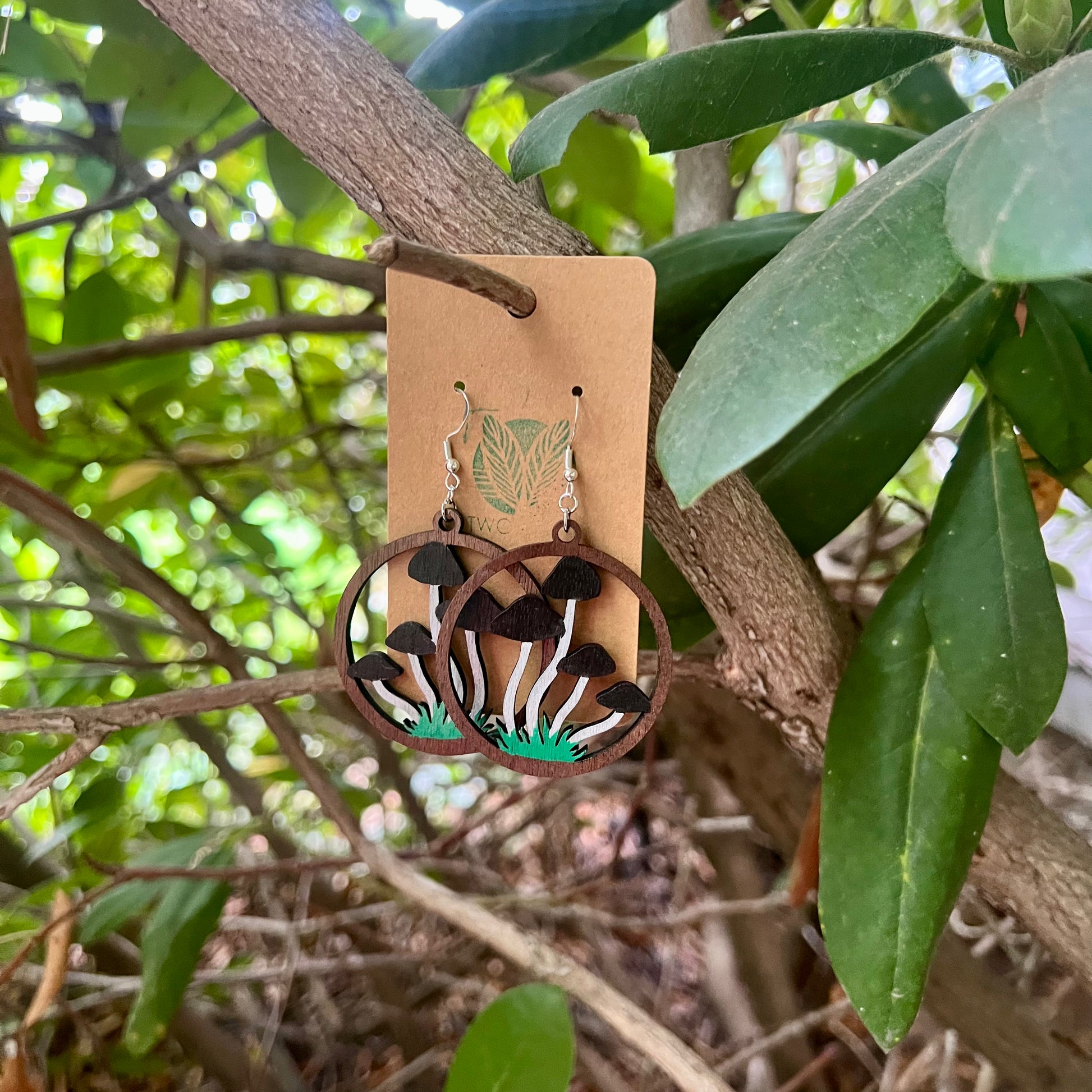 Hand painted. Dark-capped mushrooms and soft green stems for a moody woodland vibe. Hypoallergenic.