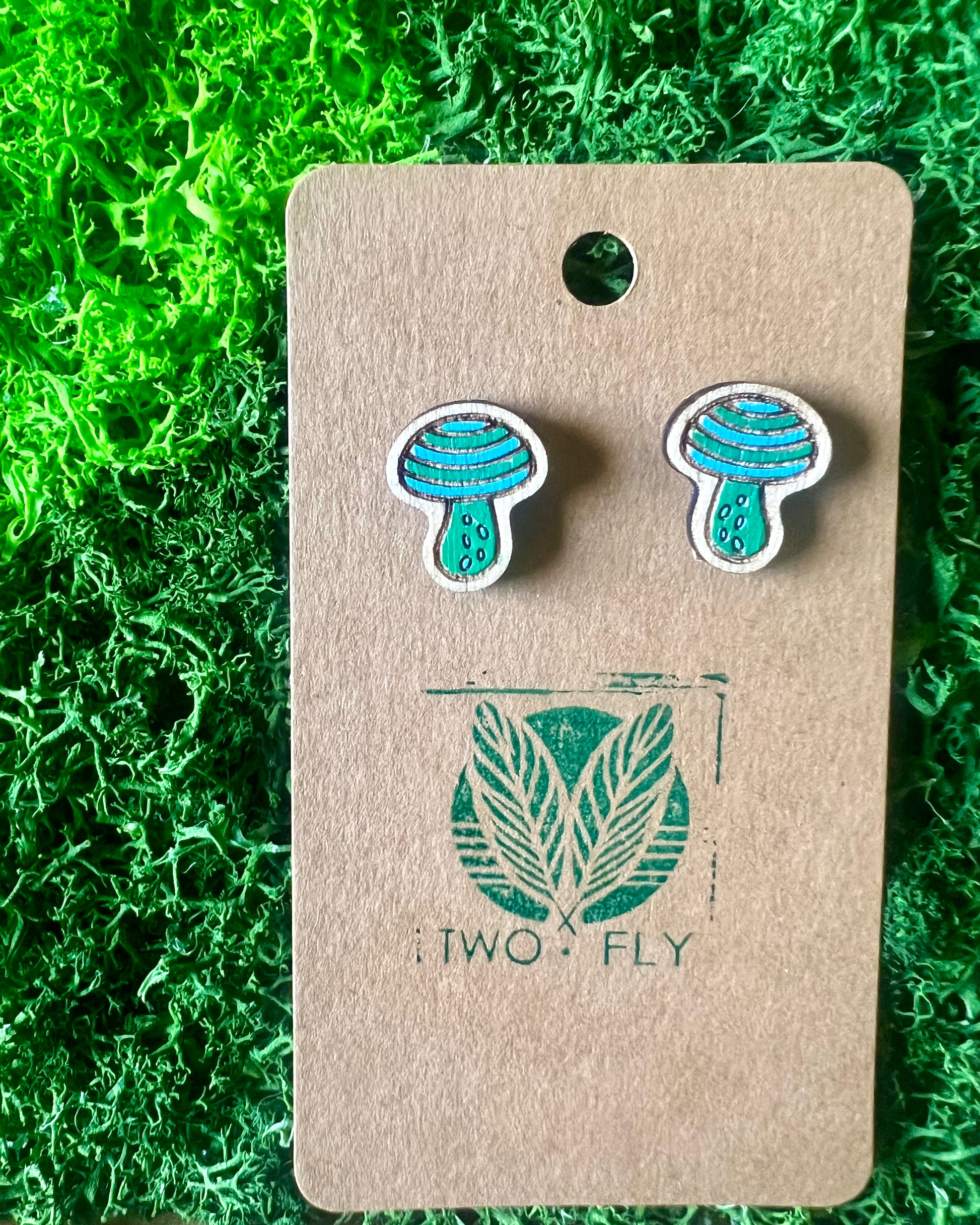 Teal and green with playful dots, like mushrooms found deep in an enchanted forest. Hypoallergenic Wood Stud.