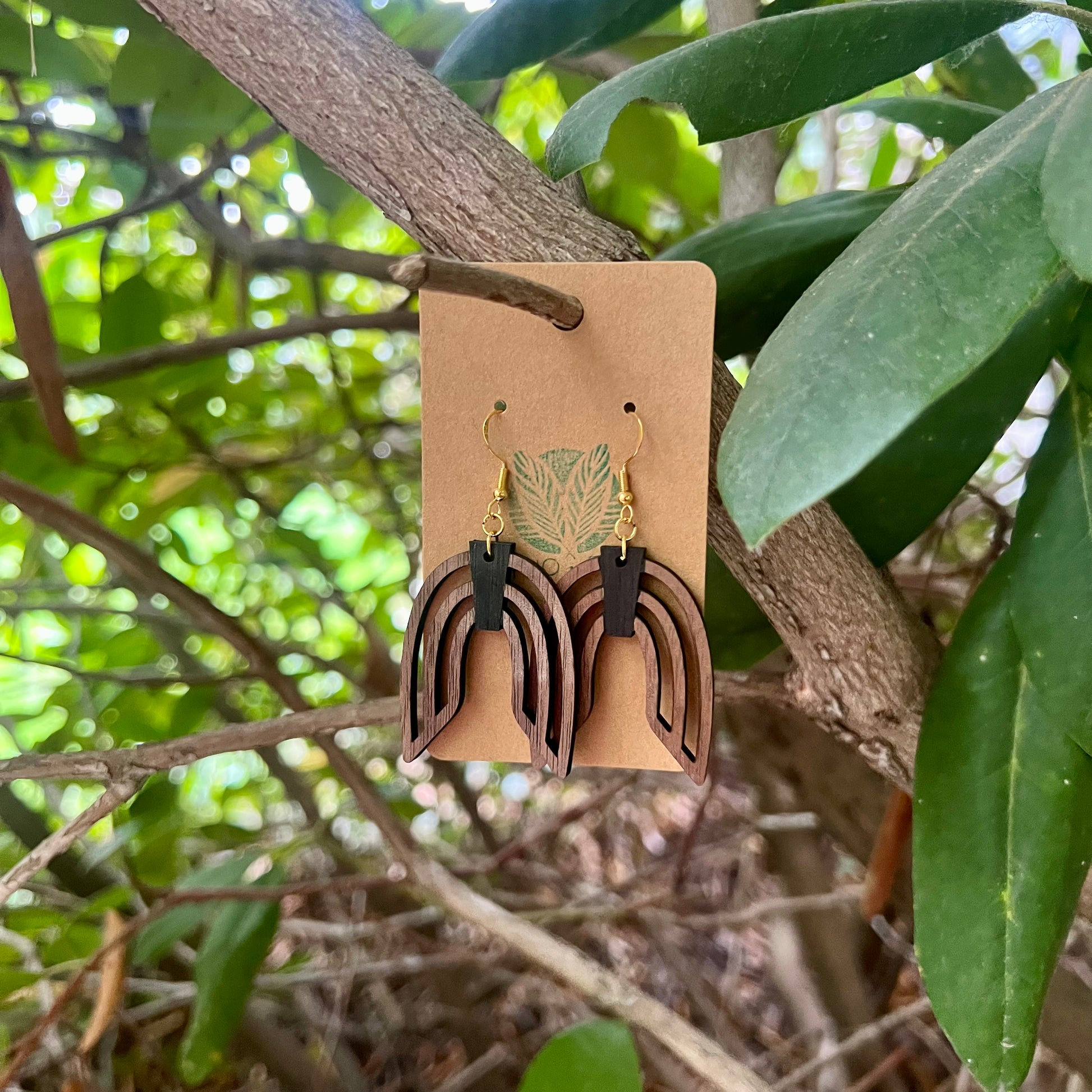 Dual-layer arch design blending deep walnut and matte black—simple, organic, and modern. Hypoallergenic.
