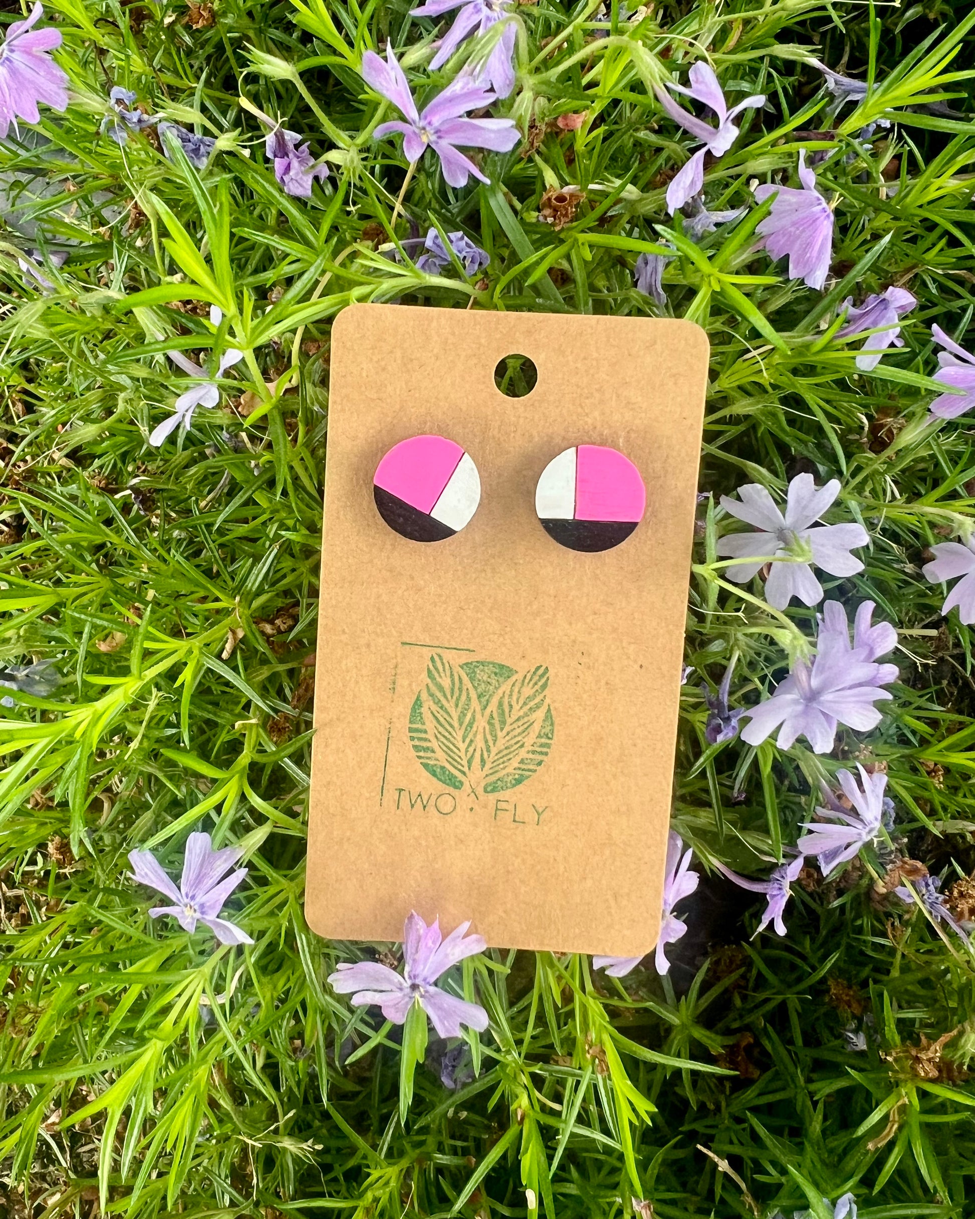 A bold blend of pink, white, and black in clean-cut blocks. These studs are crisp, graphic, and full of energy—perfect for adding a little modern edge to any outfit. Hand painted & Hypoallergenic Wood Stud.