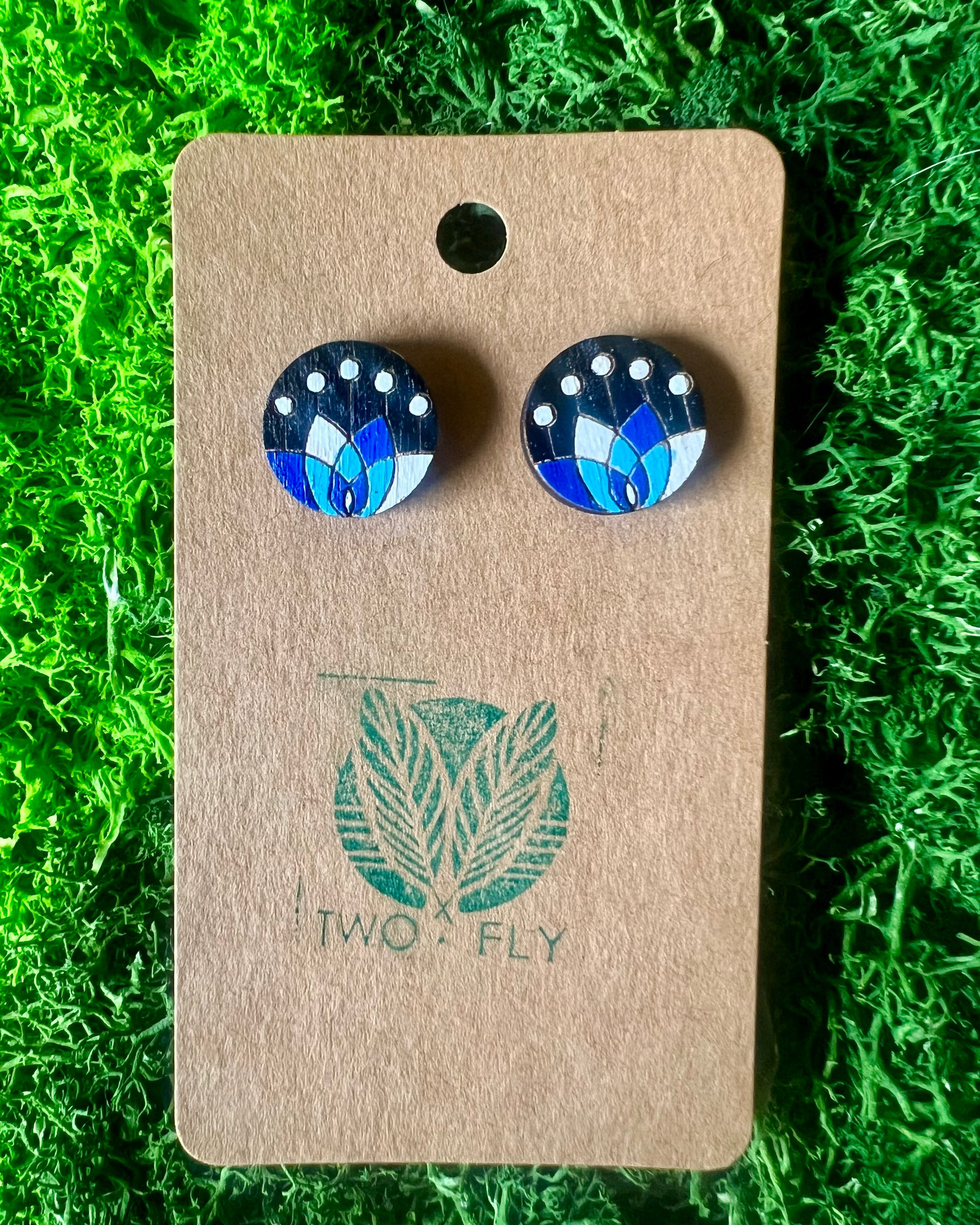 Channeling lunar magic and nighttime blooms, these studs are made for dreamers. Hand painted & Hypoallergenic Wood Stud.