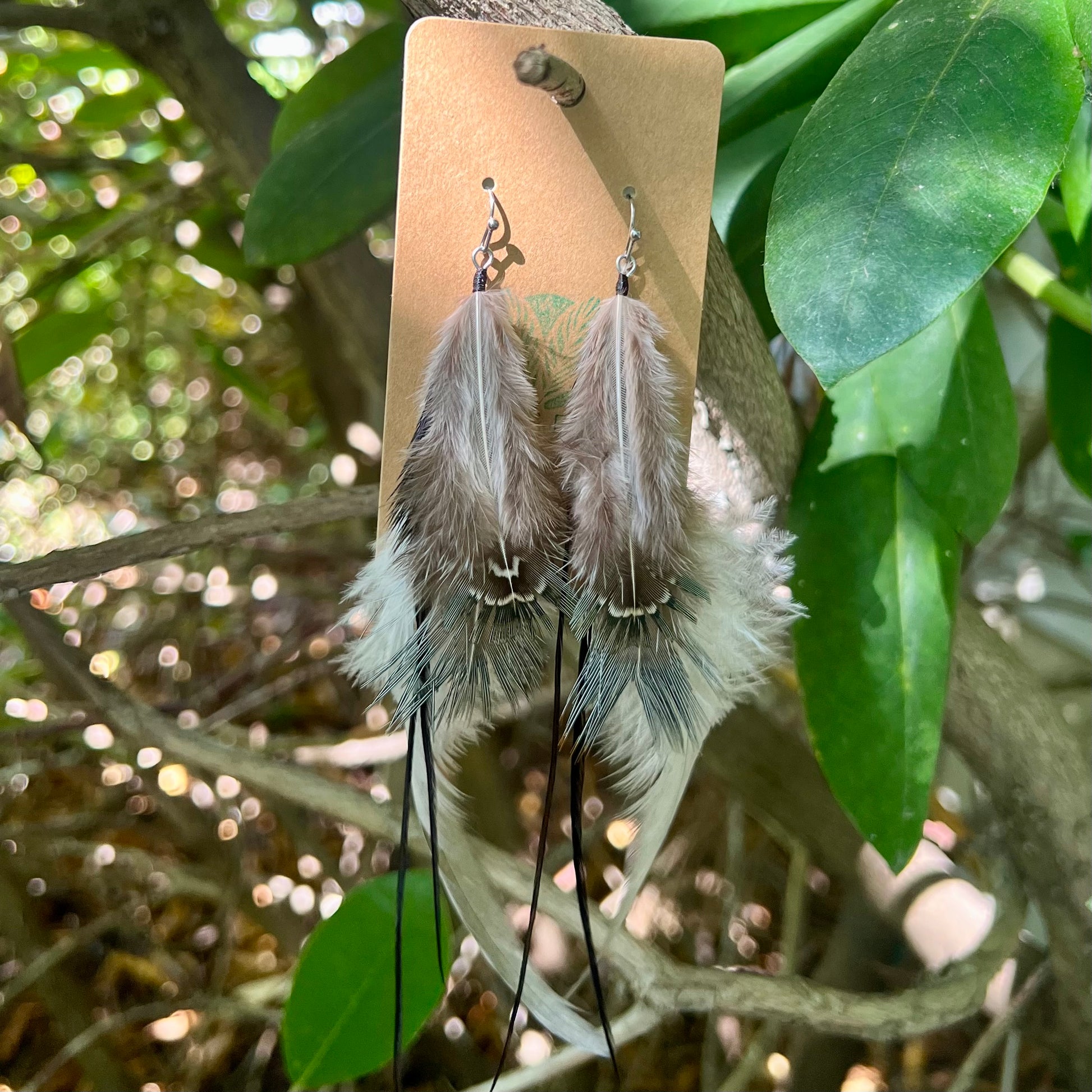 Dreamy gray and black feathers accented with subtle speckles and long wispy strands. These earrings flow gracefully, like shadows dancing under the moonlight. Hypoallergenic.