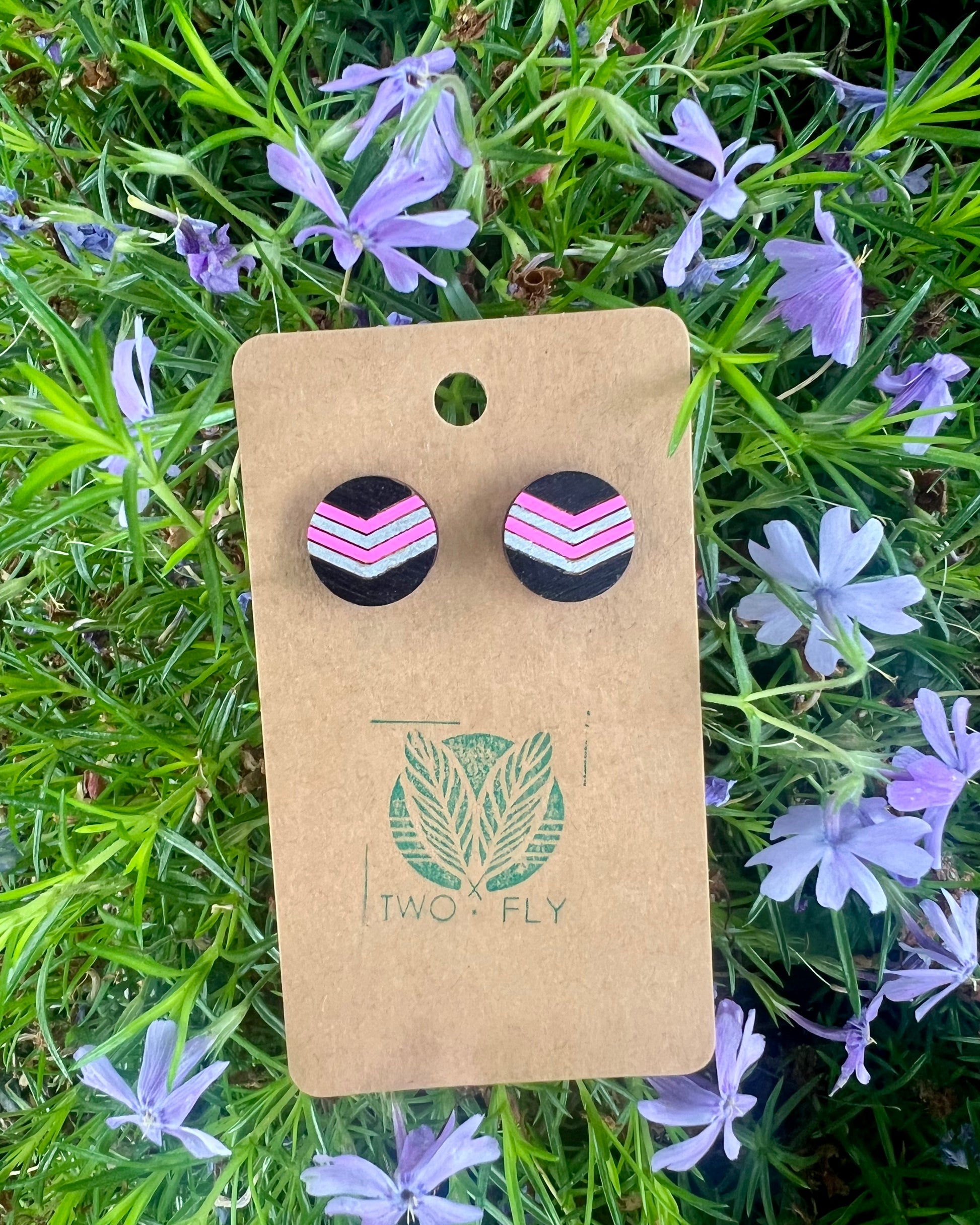 With layered chevrons in pink and silver on black, these studs give major throwback energy. Hand-painted with a clean finish, they’re equal parts fun and fierce. Hand painted & Hypoallergenic Wood Stud.