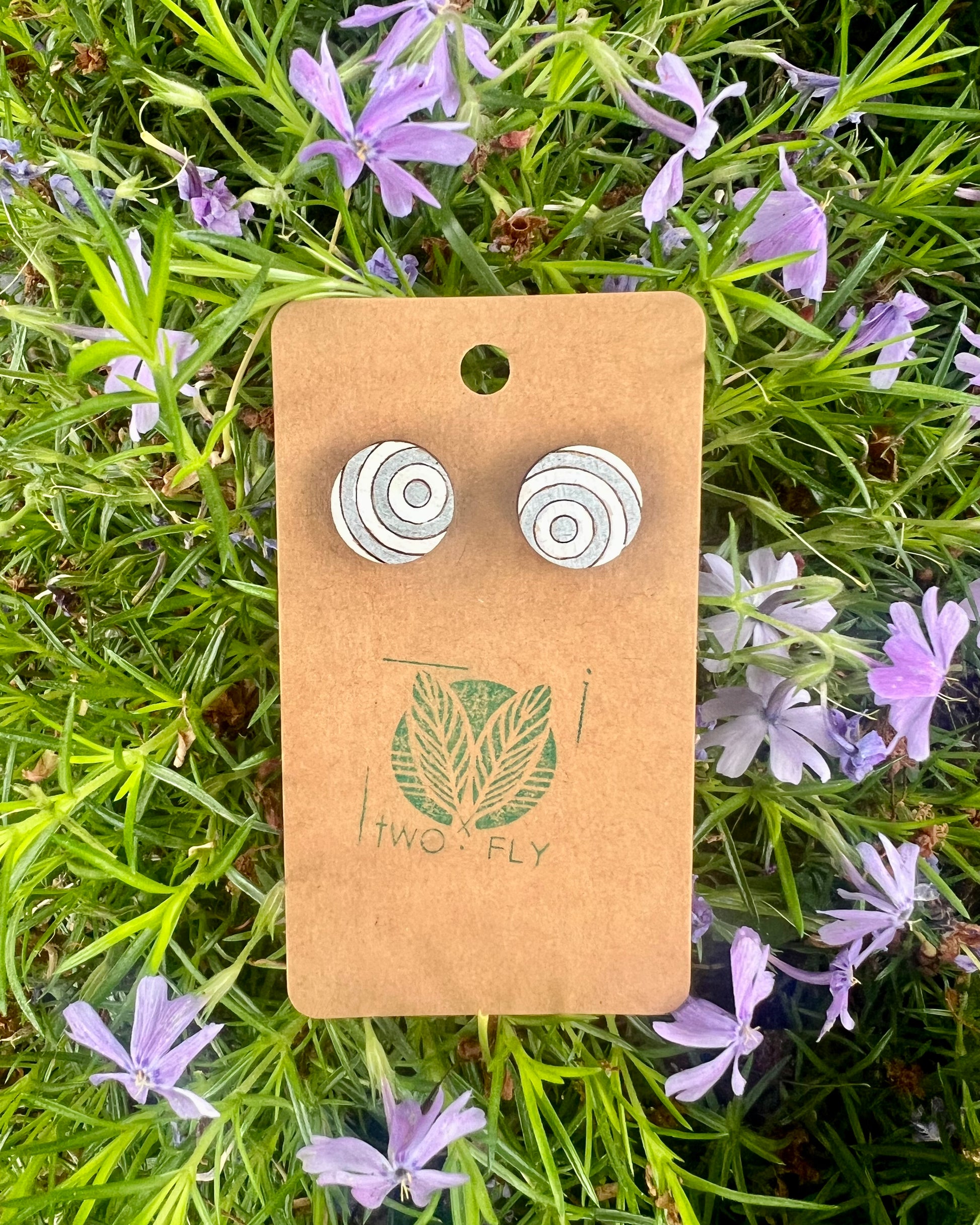 Simple, subtle, and satisfying. These concentric white-on-silver studs are calm, balanced, and minimalist — perfect for pairing with anything, anytime. Hand painted & Hypoallergenic Wood Stud.