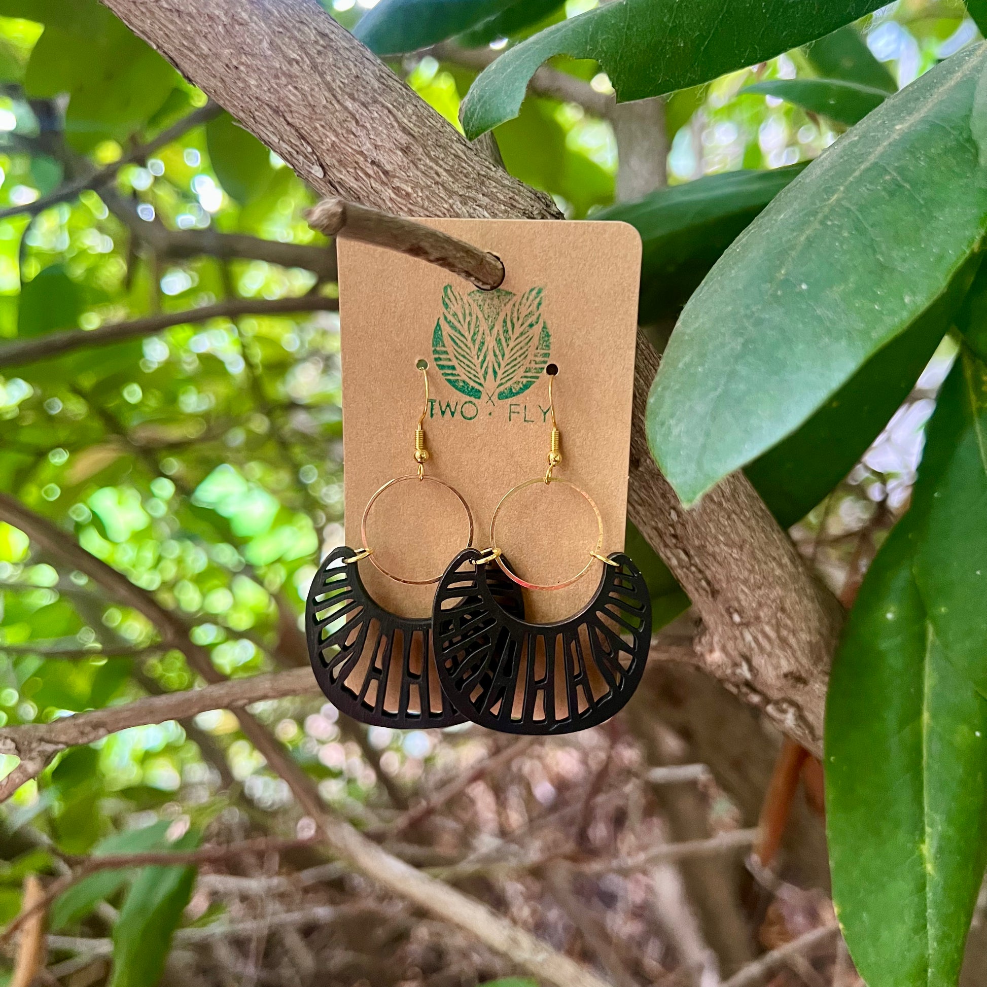 Golden hoops paired with bold black cutout crescents for a warm, earthy glow. Hypoallergenic.