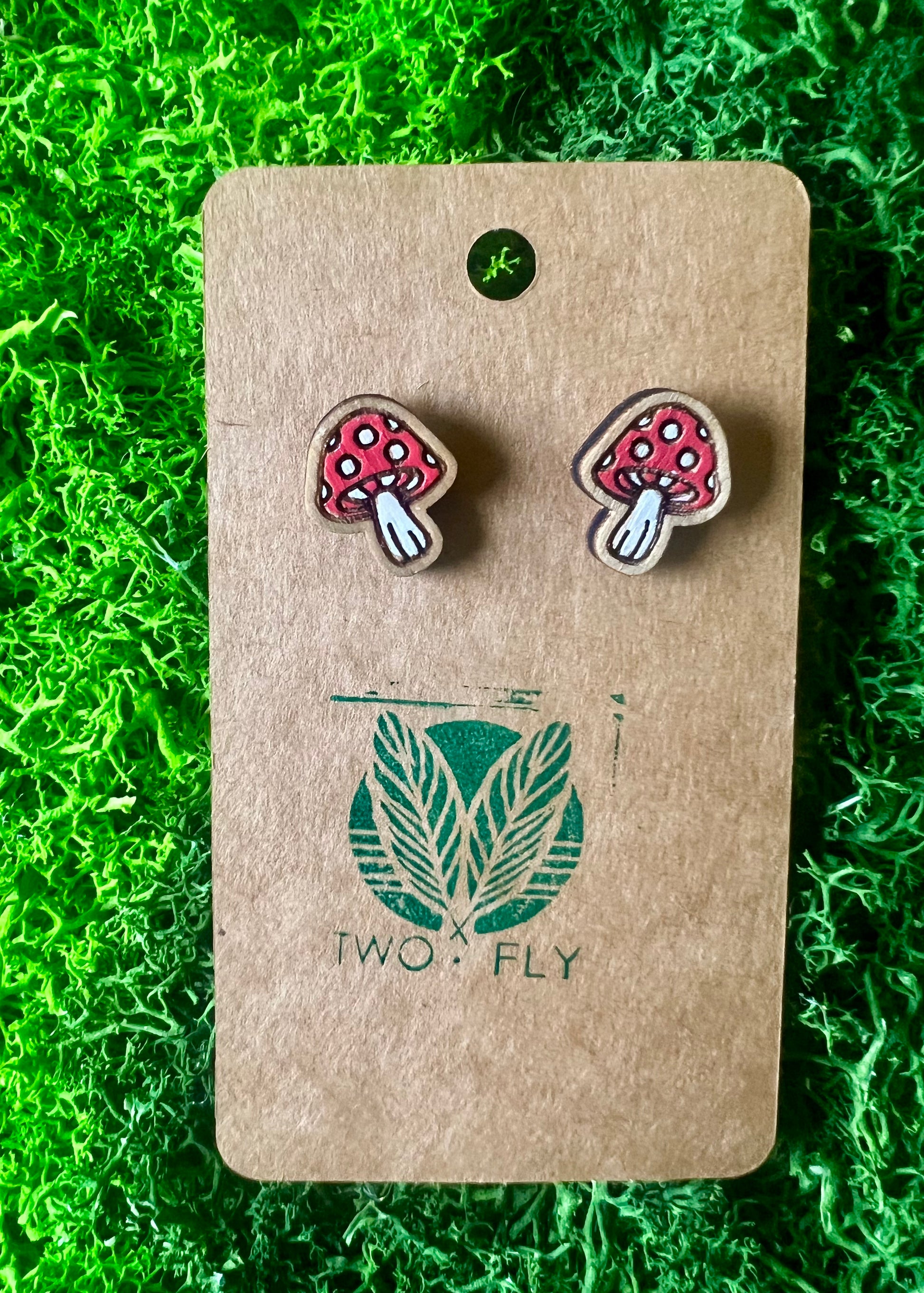 Bold red with white polka dots—your iconic fairytale fungi come to life. Hand painted & Hypoallergenic Wood Stud.